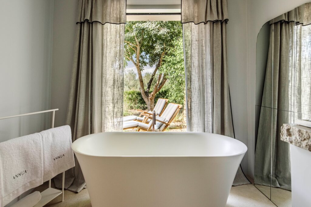 Номера оформлены с акцентом на локальные традиции: текстиль roba de llengües, мебель ручной работы, натуральный лен от Bassols, постель как облако. Ванные комнаты с душем walk-in и раковинами из песчаника, а плитка, созданная вручную, окрашена в уникальный меловой зеленый оттенок. Косметика Aesop завершает образ мягкой, сенсорной роскоши.
