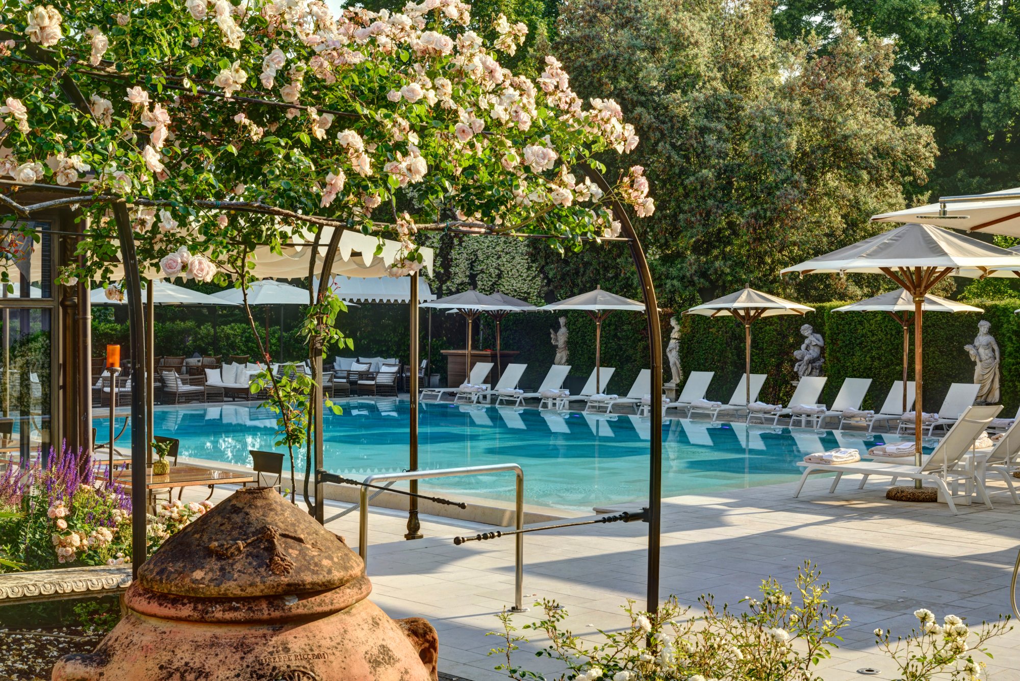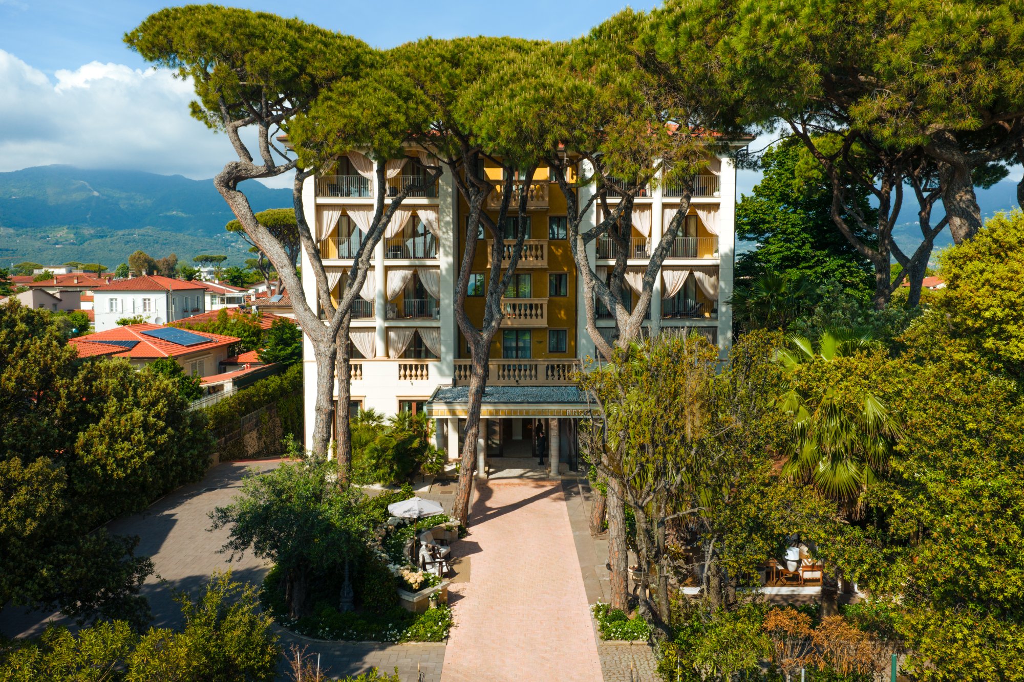 Дизайн интерьеров также заслуживает отдельного внимания. Франческа Аттолини, автор внутреннего оформления, создала пространство, которое очаровывает своим минимализмом, “тихой” роскошью и уютом с первого взгляда. Каждый элемент интерьера — от мебели, выполненной на заказ, ванных комнат, полностью облицованных мрамором, до панелей из ткани Dedar над кроватями, создают атмосферу безмятежности и утонченного стиля. К слову, для некоторых использованных в дизайне тканей вдохновением послужили прошлые коллекции Эмилио Пуччи.